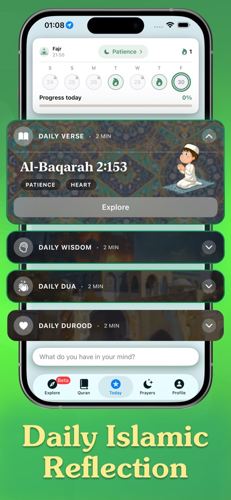 Iman Path uses your GPS location to calculate precise salah times for Fajr, Dhuhr, Asr, Maghrib, and Isha. It supports multiple calculation methods and sends customizable notifications with adhan alerts so you never miss a prayer.